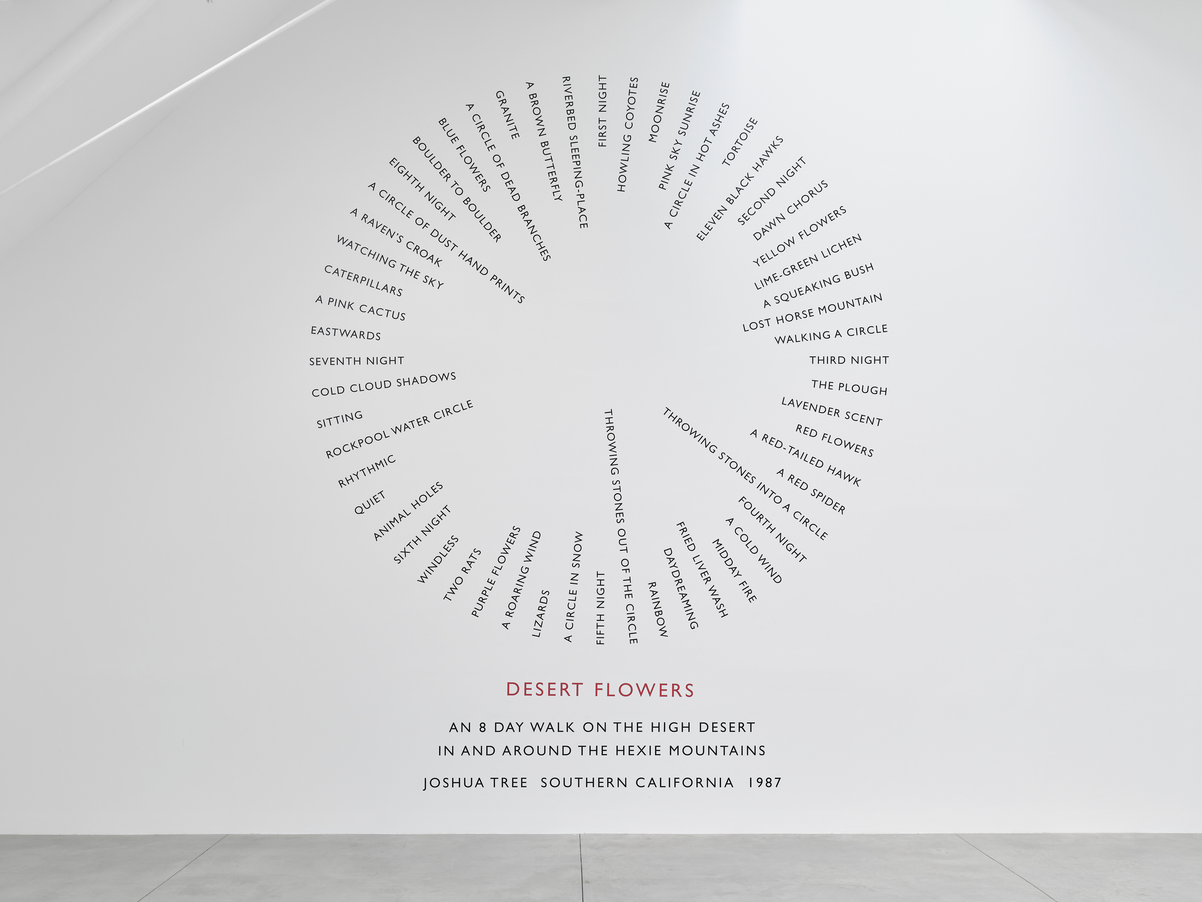 Text has consistently featured in the artist’s practice, with the earliest of the five works shown here produced in 1987 (titled Desert Flowers) and the most recent dated 2022 (A Path of Innocence). These works emphasise Long’s preoccupation with the physical engagement of the body in a variety of landscapes. He evokes the temperature and geological materiality of a given terrain, such as the fourteen rivers that flow out of Dartmoor or the lavender scents, howling coyotes and roaring winds of Joshua Tree, but additionally denotes a temporal specificity to each walk. The result are works that dwell on and explore the notion of movement, of experience in a range of dimensions simultaneously, passing through space while internalizing it, and vice versa.