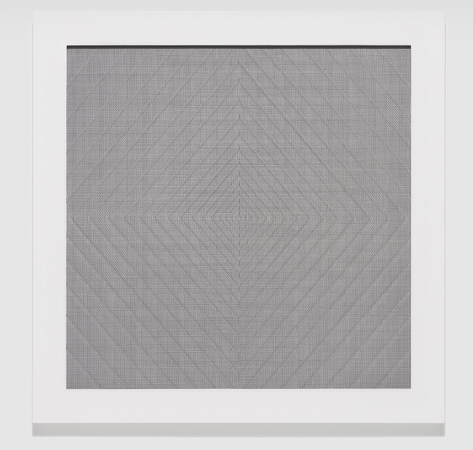 In creating her screen drawings, Donovan uses a mathematical methodology to draw out the phenomenological and illusionistic properties of the material. While some patterns seem to be rendered in relief, others appear to emerge from the depths of the grids. The intricate, layered appearances of Donovan’s patterns belie the artist’s use of one singular piece of screen for each of these works. Interstitial spaces between the lines in her compositions buzz with energy and activity, and all the screen drawings in the artist’s forthcoming exhibition are united by a sense of constant motion. Many also possess a distinctly digital quality that contributes to their aliveness.