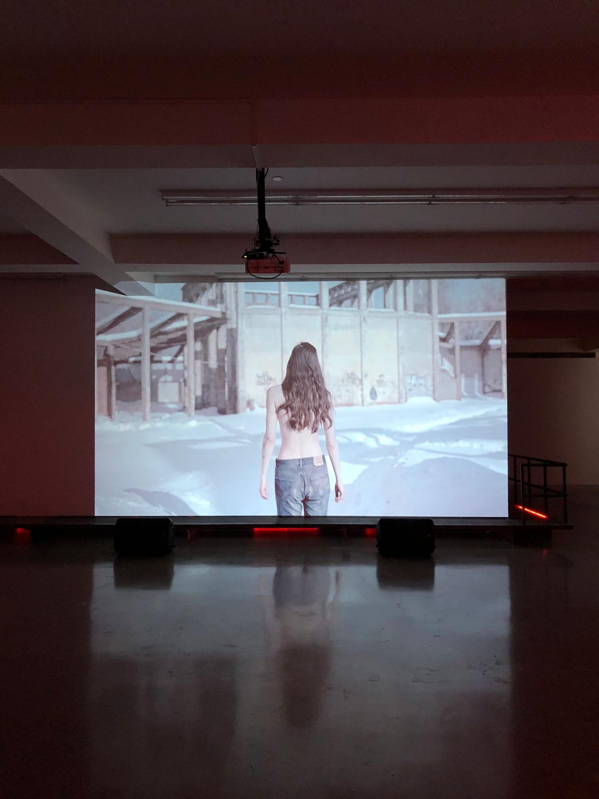 Elsewhere, Imhof contrasts the ground floor’s confinement and claustrophobia with a powerful counterpoint. In Youth (2022), a group of horses runs and communes together in an open field covered in freshly fallen snow. They seem to nurture one another, moving beautifully and freely through this natural environment to the baroque strains of J. S. Bach’s St. Matthew Passion. As day moves slowly into night, the camera gradually reveals the site to be an urban one, a historic social housing development located at the edge of the city. Yet the utopian feeling created between these animals is unmarred by this revelation.
