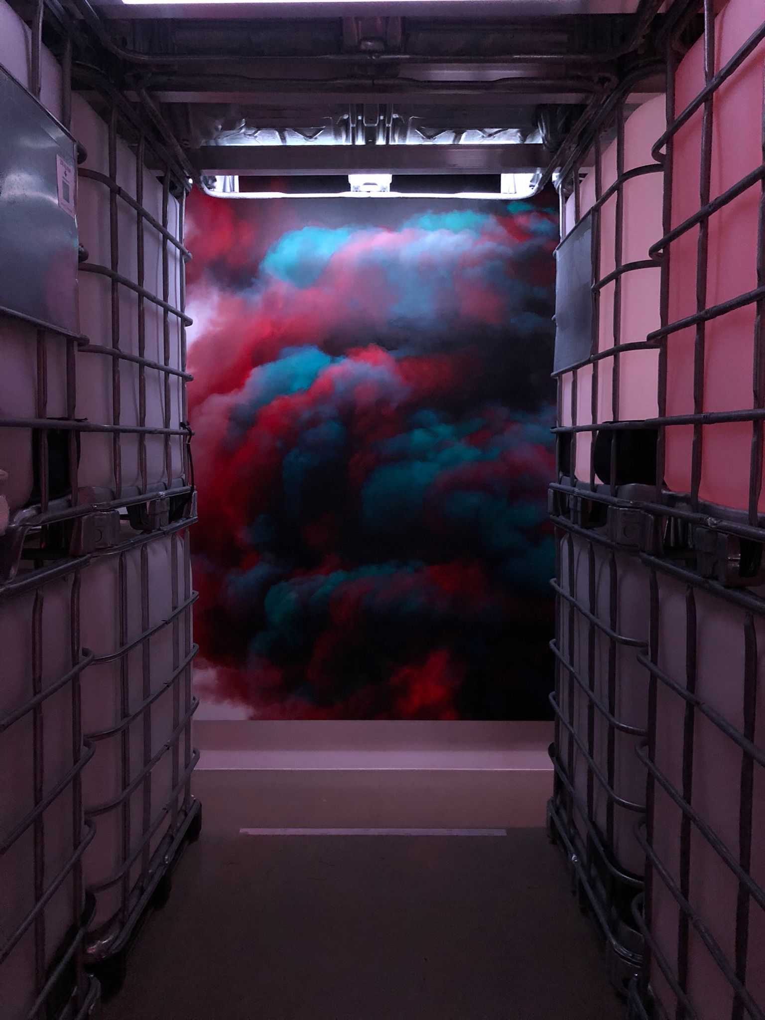 For EMO, visitors enter and first encounter a a maze of industrial water tanks that snakes through the gallery’s ground floor, creating hallways, enclosures and windows bathed in a deep-red glow. The tanks’ caged armatures stretch several feet high, obscuring both the viewer’s physical path and their sight lines onto Imhof’s paintings, creating moments of chilling encounter with immense clown faces, primary colors and swathes of clouds. The artist regularly plays with the anxiety and anticipation around what can and cannot be seen, what remains hidden and in need of excavation, as well as the charged nature of empty spaces, and here takes that notion to an extreme, a haunted house constructed of industrial materials and charged visuals.
