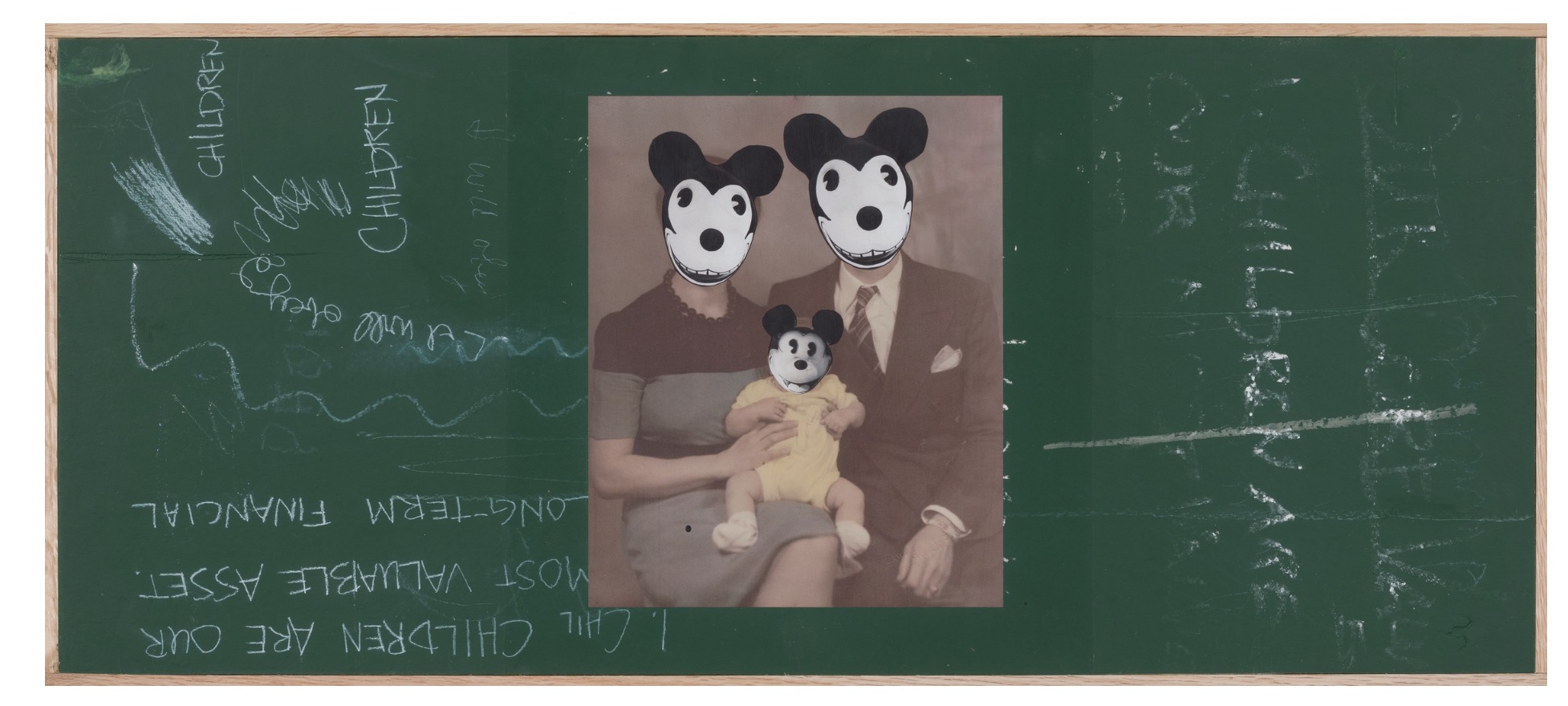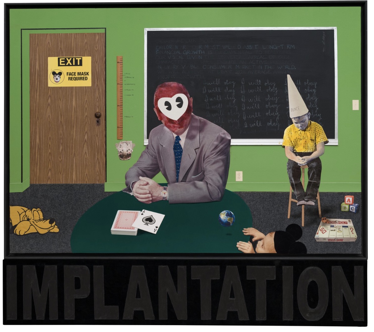 Having progressed from the unsettling imagery of his early 1960s paintings, through the geological and postcard subjects of his late ’60s and early ’70s work, to the “bloody head” series of figures from later that decade, the artist also became known for singular combinations of painting with wood, found clothing, and upholstery fabric. Foulkes’s mordant social commentary has consistently targeted human cruelty and challenged the excesses of corporate America—particularly the Walt Disney Company. This continues in the current show, with the artist once again sharpening his blade against the corporate behemoth. In Family Portrait (2022), the artist has replaced the heads of a couple and baby in a formal photograph with black-and-white visages of an ossified Mickey Mouse. The image is set against a chalkboard covered with half-erased messages about the financial worth of children. The cartoon rodent also crops up in Implantation (2019–21) and Untitled: Baby Mickey (2020). In the former, he appears in the form of a classic round-eared hat, on the face of a wristwatch, and as the graphic on a “face mask required” sign. The title, inscribed beneath the image, refers to the moment when a fertilized egg attaches to the uterine lining, an allusion to the beginning of life that here allegorizes commercial indoctrination. In the latter work, the familiar silhouette of Mickey’s head masks that of a baby in an ornate vintage gown, wholly erasing its identity.