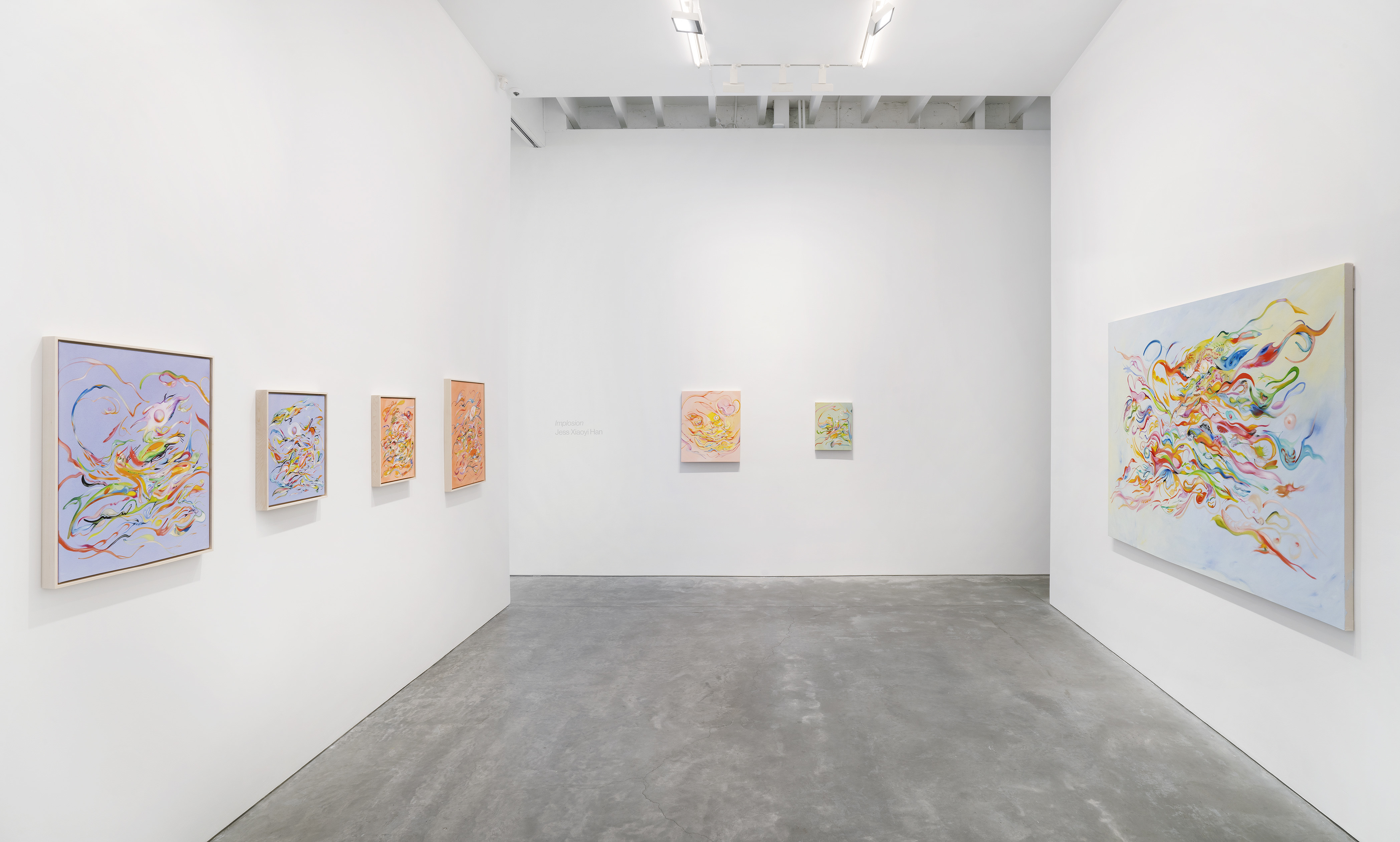 Currently exhibiting at Ross+Kramer Gallery’s Chelsea location is Chinese artist Jess Xiaoyi Han’s debut solo show Implosion, a series of her most recent paintings which explore abstract articulations of internal fluctuation and transformation. This new body of work, painted with alkyd on canvas, reflects an evolution in the young artist’s meticulously controlled and expressionistic style —the compositions are increasingly crowded with frenetic arrangements while still maintaining a cohesive and meditative fluency. Han’s luminous canvases, saturated with a vibrant, candy-colored palette, burst with streams of fluid brushstrokes, emanating a sense of dynamic movement through illusionistic space.