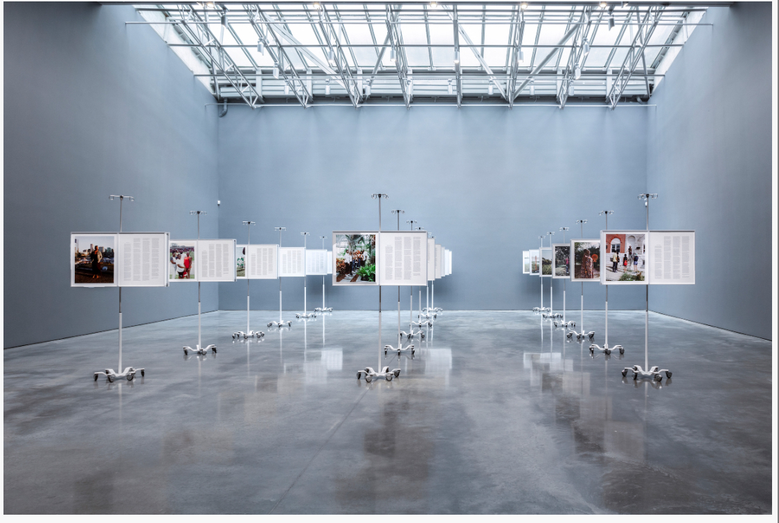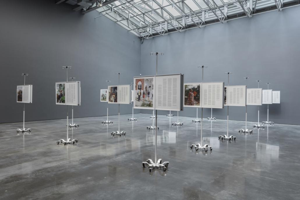 Comprising stainless steel IV poles, archival inkjet prints, and text panels, this installation was created as a celebration of the community health workers (CHWs) of Baltimore, Maryland, and proposes a new approach to monument making in the 21st century. The work, which was first conceived of after the artist faced a series of medical injustices, including difficulty obtaining a Covid-19 vaccine, takes community health workers as the centerpiece of the work. Frazier transcribed, edited, printed, mounted, framed, designed and fabricated this immersive monument for workers’ thoughts on behalf of, for, with, and about the role and importance of CHWs in society and their relationships with doctors and faith leaders in their community who strongly advocate for their work and livelihoods. This monument proclaims that community health workers should be seen as a profession, as salaried employees with full healthcare benefits and leave. The monument is comprised of eighteen medical IV poles that are nine feet tall and social-distance-spaced. The audience is welcome to walk among them to embody the social distance we’ve come to know so well, to contemplate and reflect on each testimony and portrait face-to-face, and to have a moment of silence in order to mourn the loss of loved ones to COVID-19.