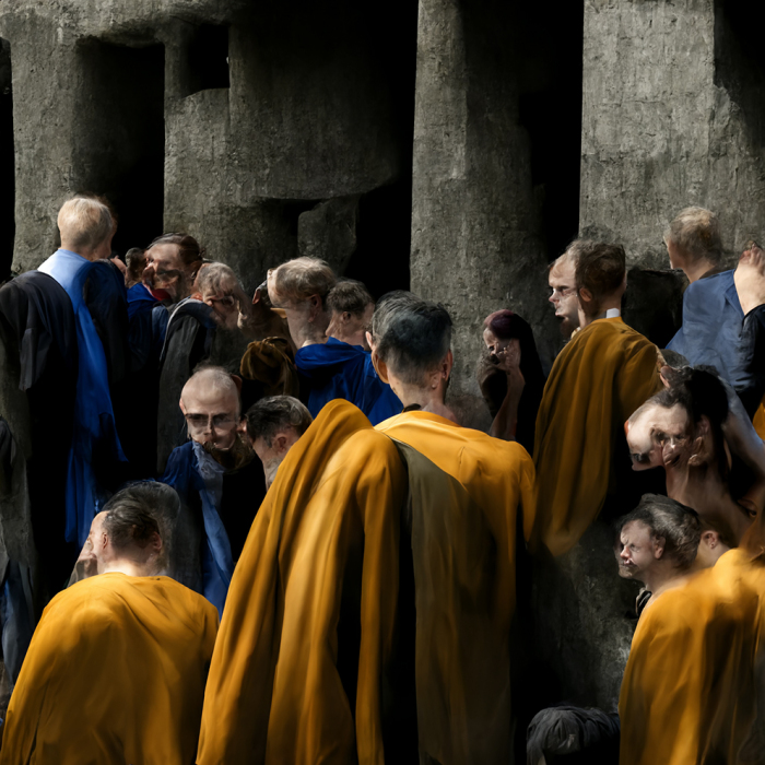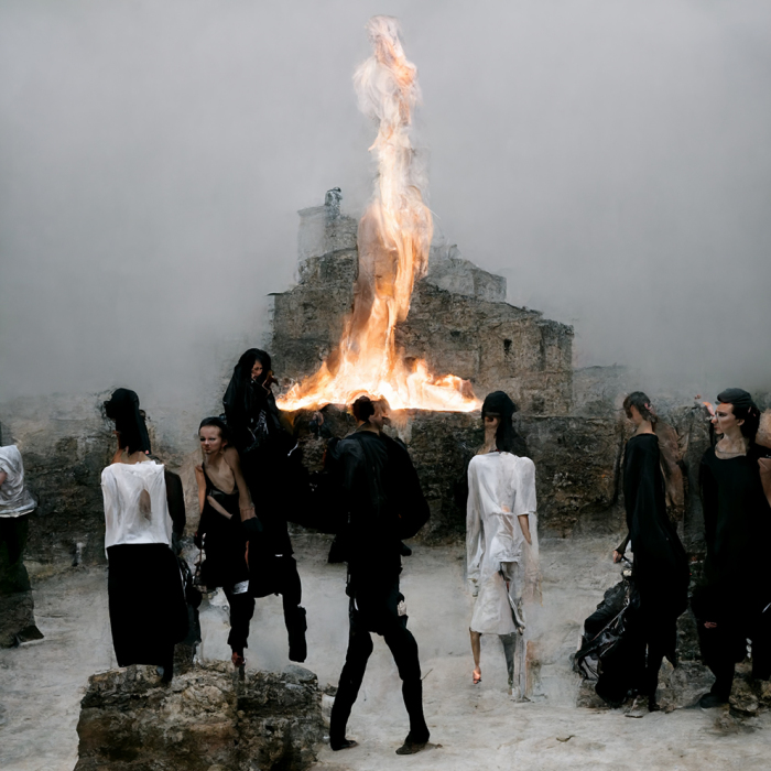 GABRIEL O’SHEA – I have been working with AI software for about a year now. I started experimenting with AI software, teaching it to recognize my aesthetic. I produced almost 3000 images this year and I selected around twenty images for the show that were connected to the exhibition, Preludio. The more I experimented with AI, the longer and more detailed my instructions would get.  I realized that the order I put the words in really mattered. If I put in a sentence with different wording or in a different order, but technically with the same meaning, the outcome would be entirely different.