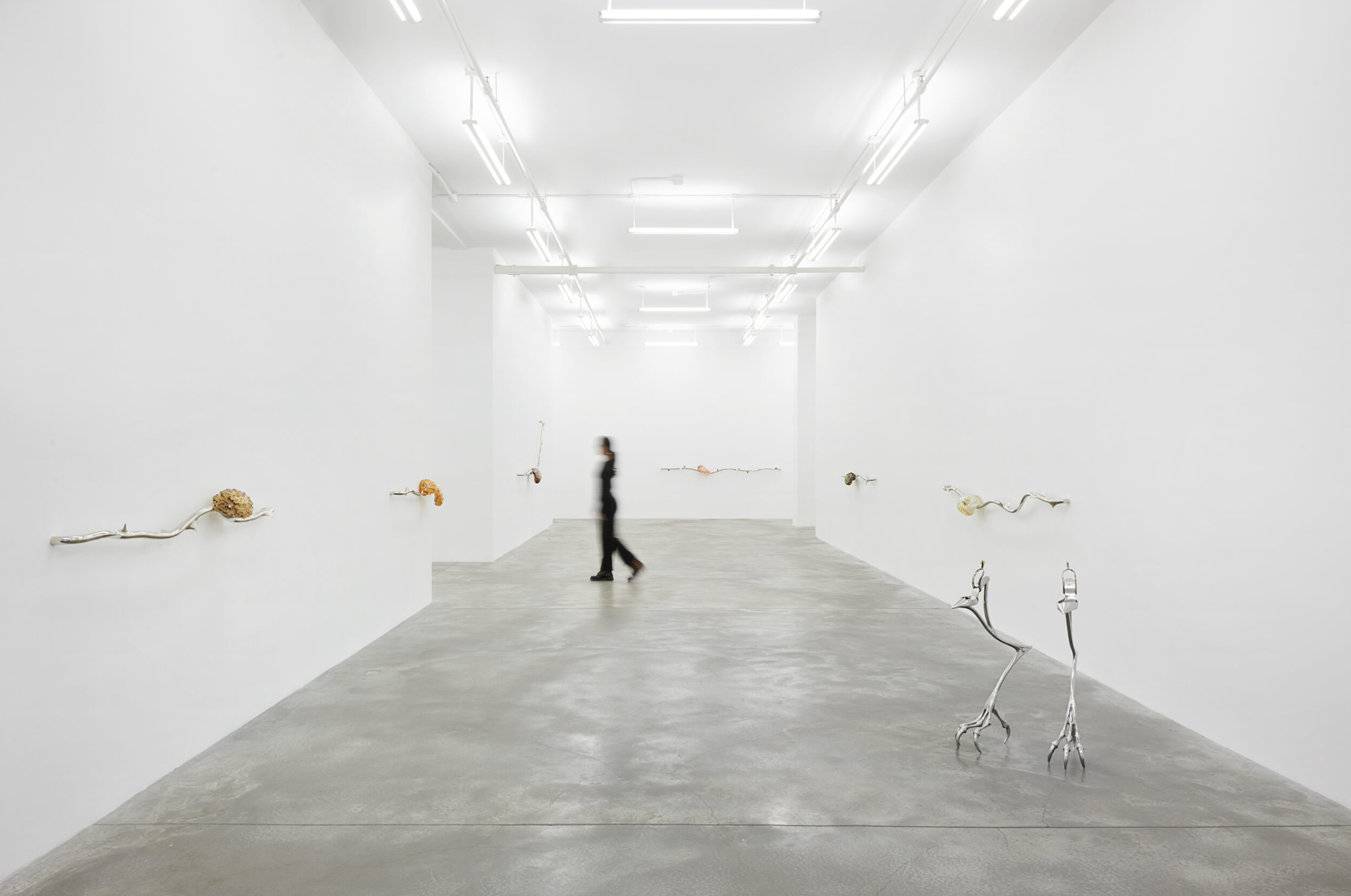 Two unique sets of polished stainless-steel sculptures resemble stilts. Constructed using a modular ball and socket joint system, the carved talons are newly articulated and robust, updated from Levy’s earlier iterations of the same kind. They resemble the feet of a bird of prey, a brutal interpretation of the clawfoot supports of freestanding bathtubs that gained popularity around the turn of the 20th century. Levy’s references for the ‘shoe’ of the sculpture lie in high fashion stilettos, with pointed metal toe boxes that incite a tactile memory of soft tissue squeezed into a too-tight shoe.