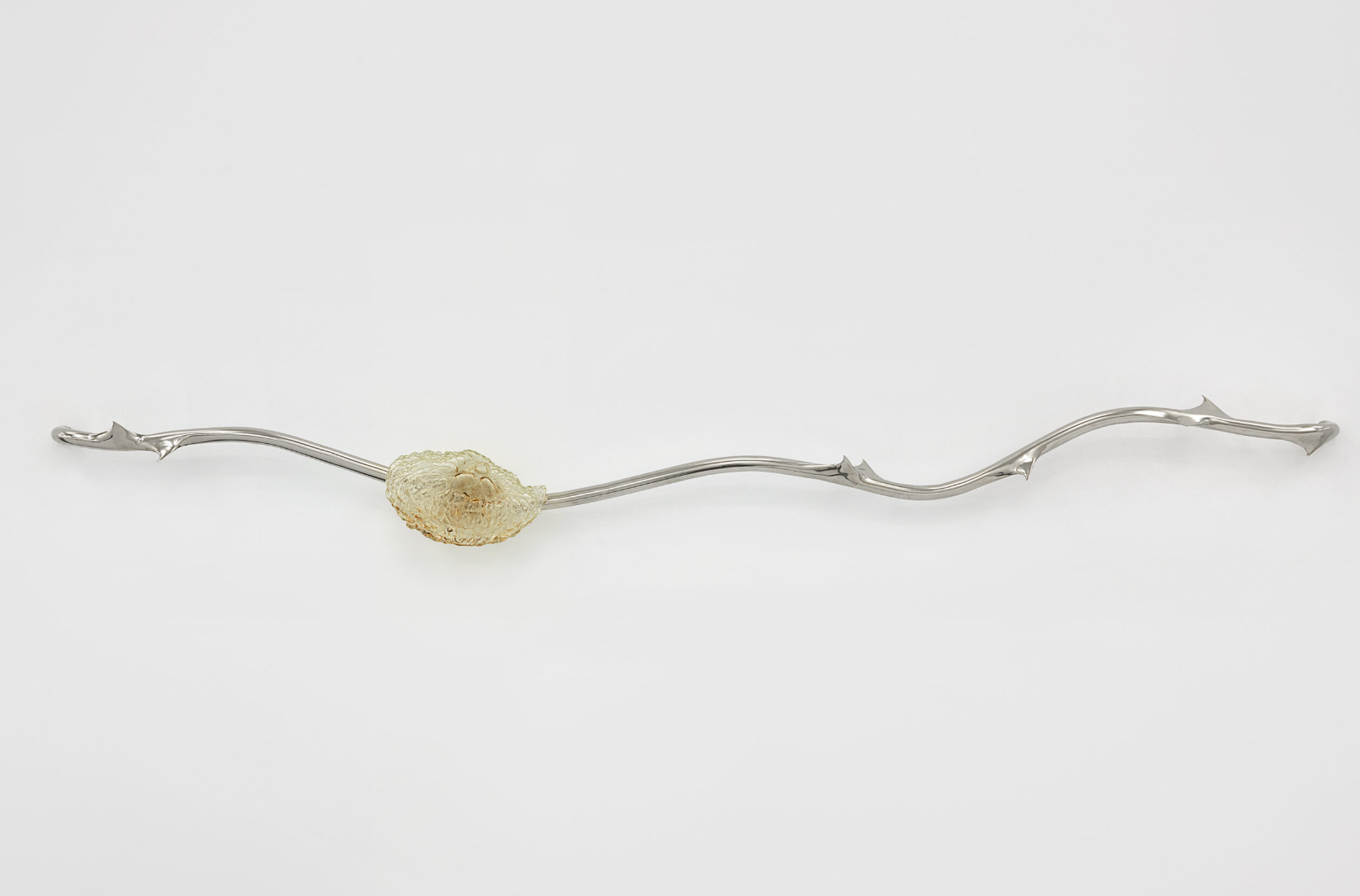 Concentrating her source material—which spans vegetables, medical equipment, prosthetics, and furniture—on forms that implicate mobility aids, Levy considers our physical and psychological relationships to our built environment. A series of unique steel railings line the walls of the exhibition, inviting support while remaining untouchable. Thorns punctuate the rails’ sinuous curves, poised to pierce the hands that seek to bear their weight. Rather than aid, they deter, seemingly warning viewers of their own frailty. Other barbs cradle deflated, multi-hued glass casts of gourds, a reoccurring motif that is rendered with blown glass for the first time. Akin to diseased, flaccid flesh, the glass gourds sag over each rail like fruit on a vine, deflating as they rot.