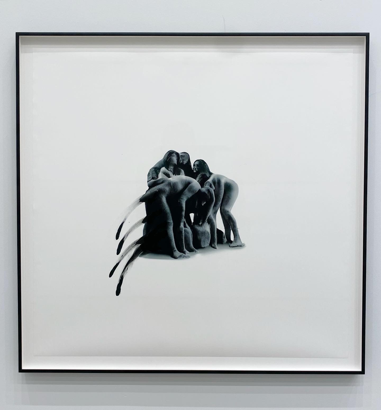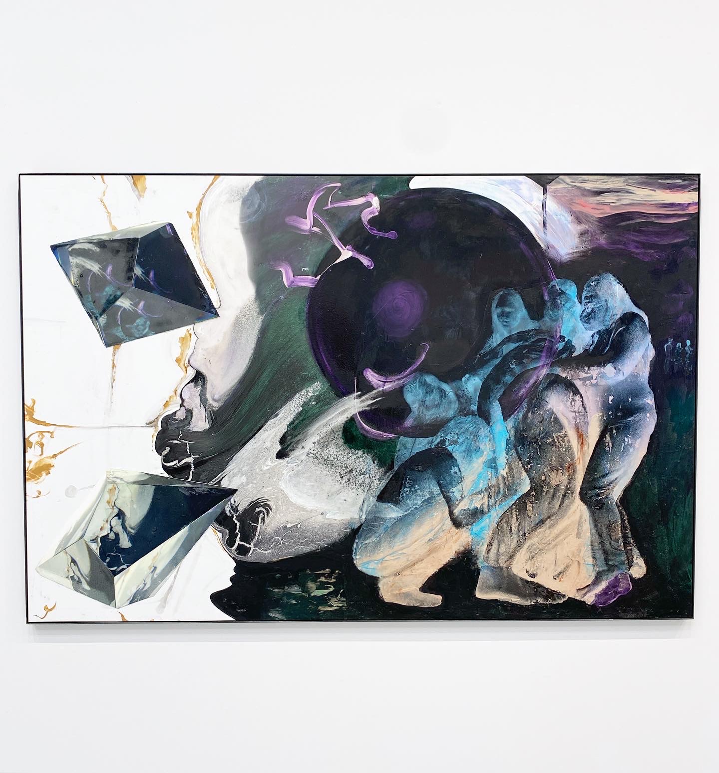 This hybridized technique arrives at a range of works that swim in and out of legibility. Familiar forms and figures (bodies, eyes, hands) are twisted through the lens of the hazy, often hiccuping methodologies of modern AI image production, and create forms that seem to evade the viewer. In many works, what appear as cups or domes seem to jut out from the canvas, yet the actual object is strikingly unclear. Despite lingering contemplation, one struggles to understand just what they are.