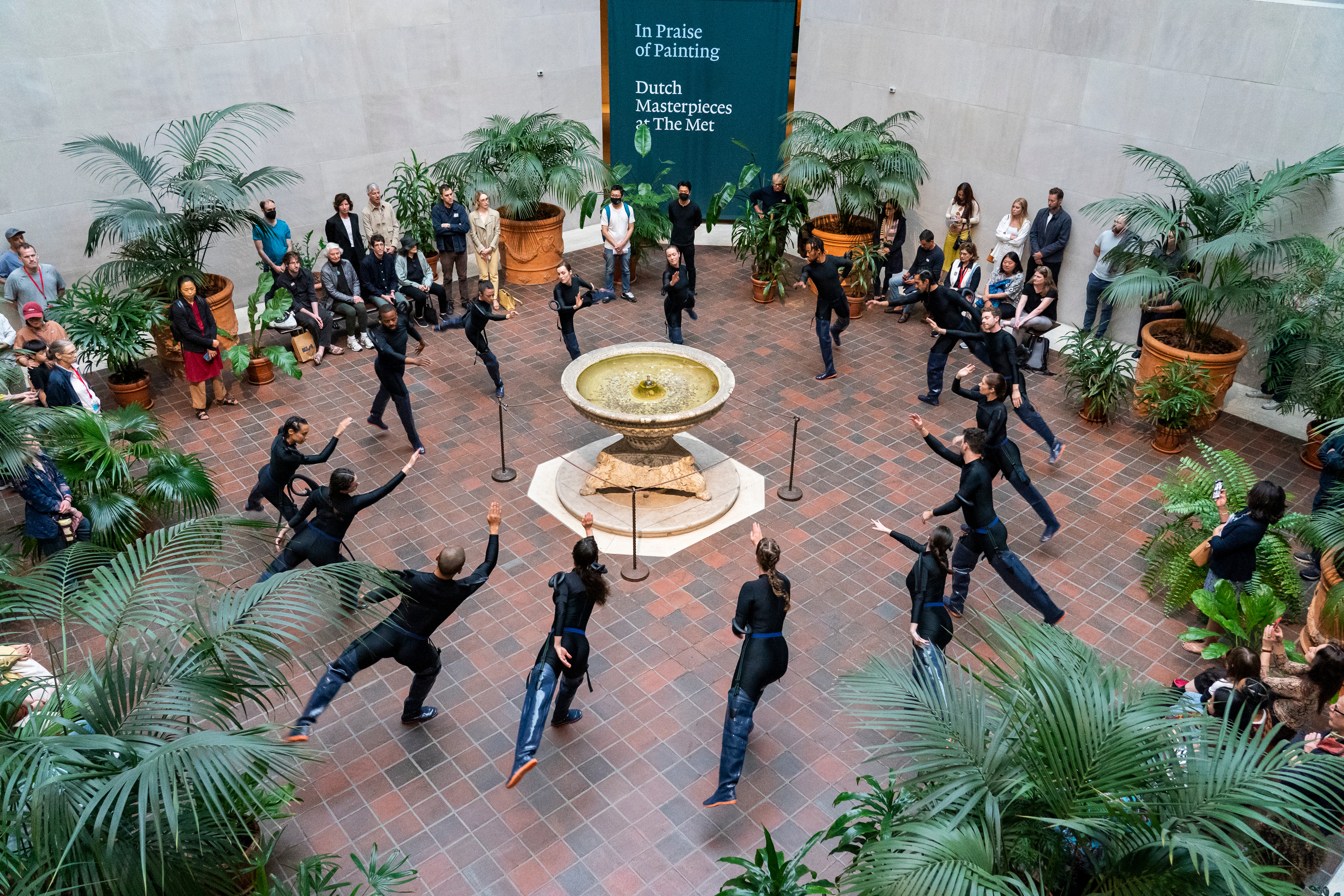 Hollander began conceptualizing the choreography by looking at the patterns that water made through the fountains’ pumping systems, reimagining the outline of the shapes as a sequence of gestures. “We used these pathways as a preliminary score, but the second we performed them in the space and on our bodies, they immediately evolve and morph.” The original trajectory of the parade was to have the dancers pass by and circle all eleven of the fountains in the Met. But given the reality of being surrounded by antiquities and very valuable artwork, Hollander had to present the plan of the project to each of the various departments for approval. In the process, the performance was reiterated and edited. “The shape and pathway of the “Hydro-Parade” loop is actually choreographed in many ways by The Met itself, with all the bureaucratic rules and departmental standards that comes with the institutional space.”