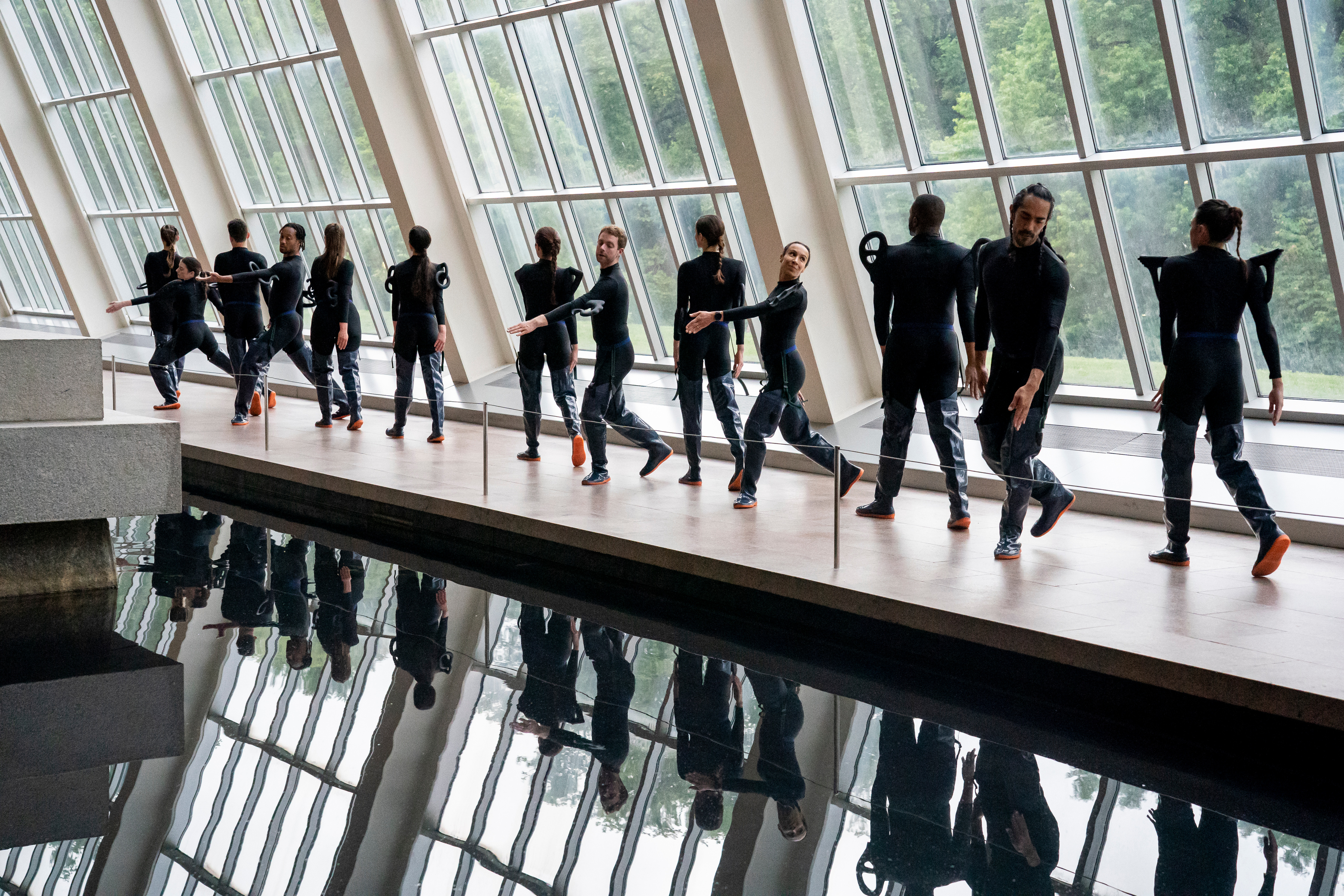 On a June evening at the Metropolitan Museum of Art, a stream of 15 dancers dressed in sleek costumes consisting of shapes resembling water-bearing vessel handles on their arms and thigh-high rubber waders on their feet, maneuvered through the crowded galleries on the museum’s first floor in a continuous, metronomic fluidity. Audiences staggered closely behind, streaming past grand halls and various antiquity rooms, clusters of tour groups, confused museum attendees, and each other, in an eager, and often entirely coincidental, attempt to keep the dancers in sight. The 90-minute performance titled “Hydro-Parade” was Madeline Hollander’s most recent performance project commissioned by MetLiveArts.