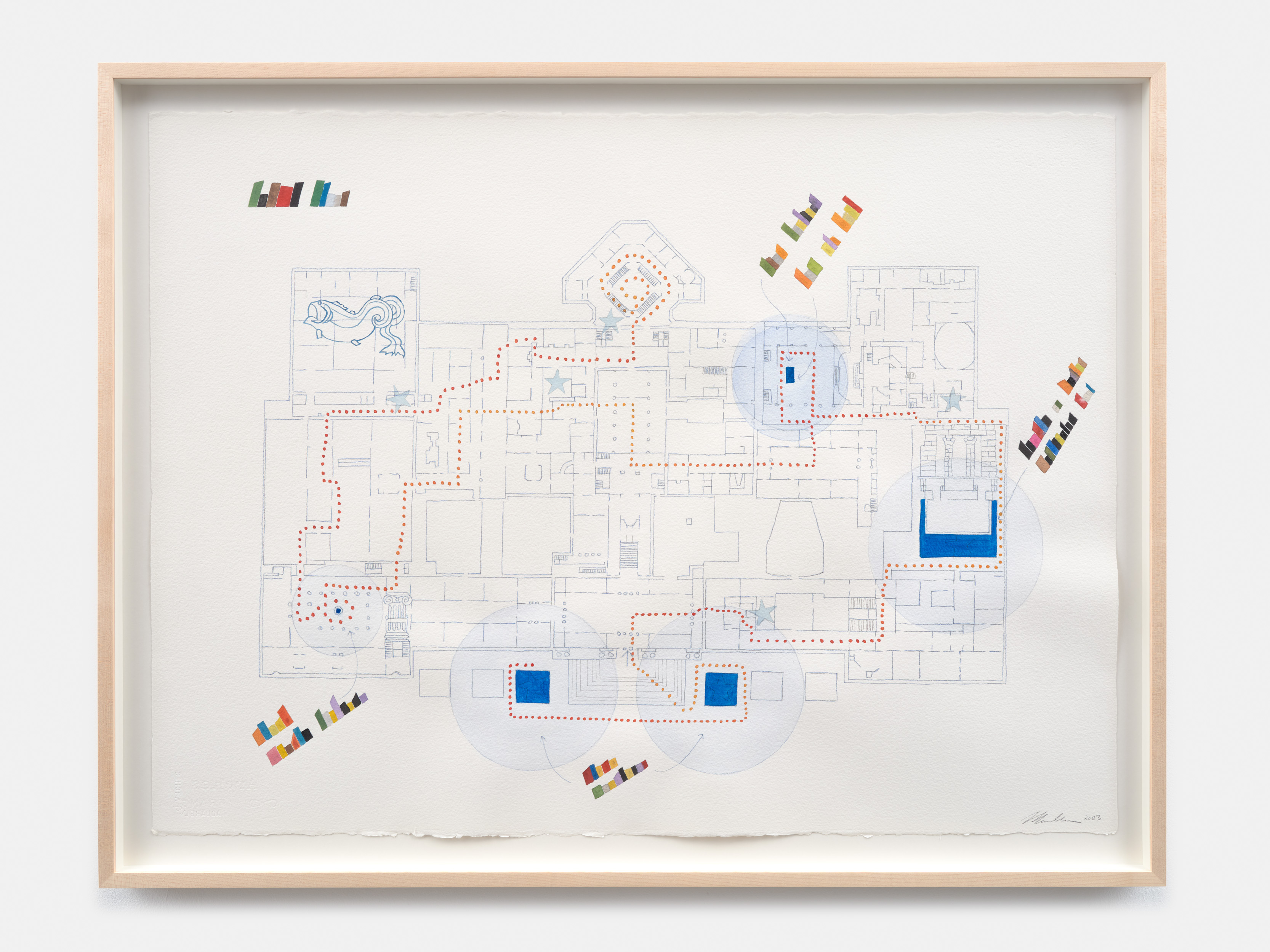In the process of research and preparation for the “Hydro-Parade” performance, Hollander created 27 watercolor sketches, each with specific color associations through her natural synesthetic processing, that trace the movements and pathways of water sourced from the natural springs beneath the museum.
