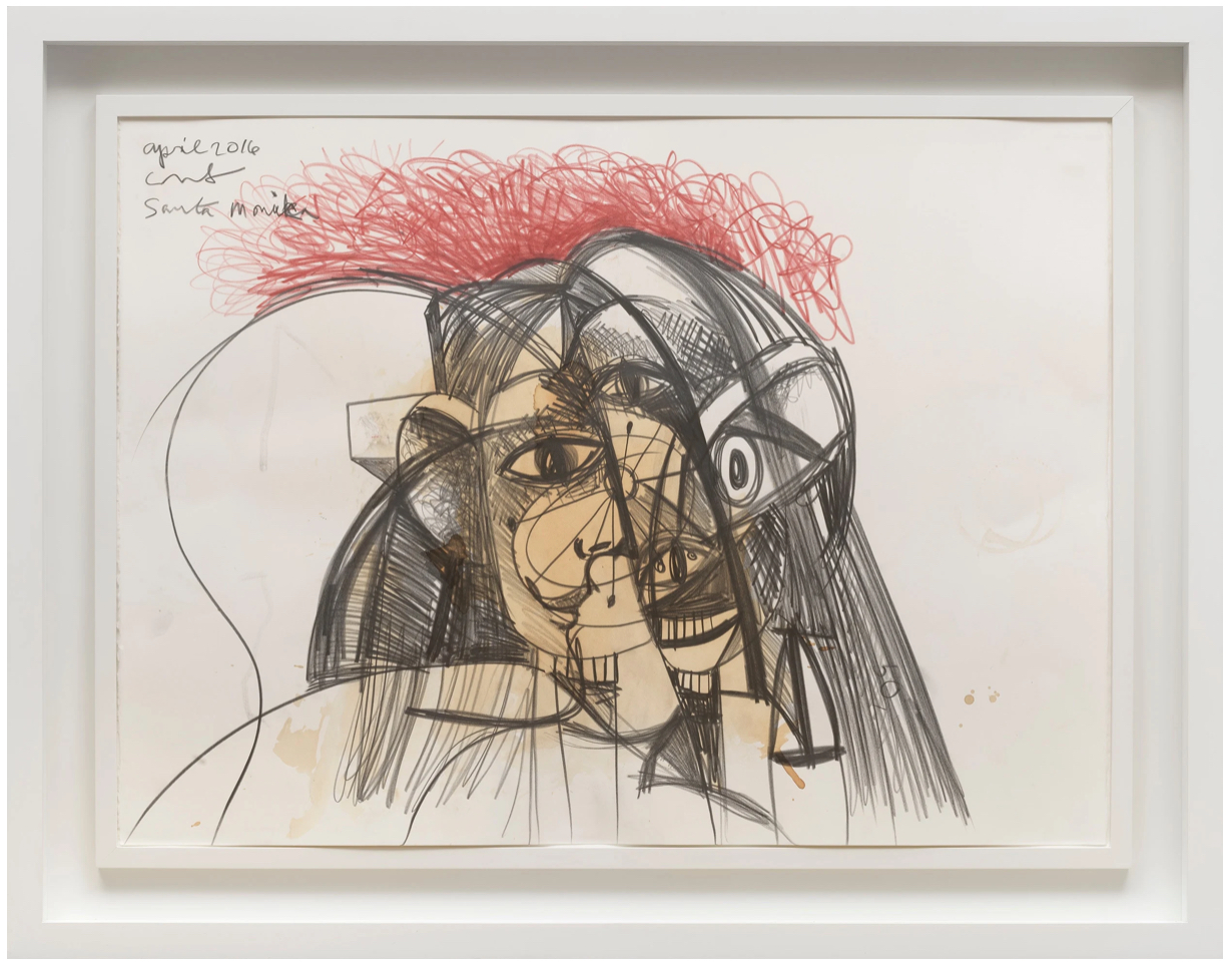 Throughout, humor is employed to magnify a feature of the subjects depicted by many artists in this show. Here, R. Crumb’s lustful and satirical cartoons meet George Condo’s intimate and psychological stylizations of figures. Likewise, the animated figures in Nicasio Fernandez’s paintings often appear in exaggerated emotional states and escalated situations. In Stewing, Fernandez makes a visual pun between the feeling of dwelling in one’s anxieties, being cooked, and soaking in a jacuzzi. Hulda Guzmán’s painting Kali, you’re so funny portrays another pictorial quip in this show in which a cartoon-like rendering of the Hindu goddess of destruction Kali is reveling with the artist’s father, the architect, as they construct their family’s home in the North of the Dominican Republic following a hurricane’s destruction of its roof.