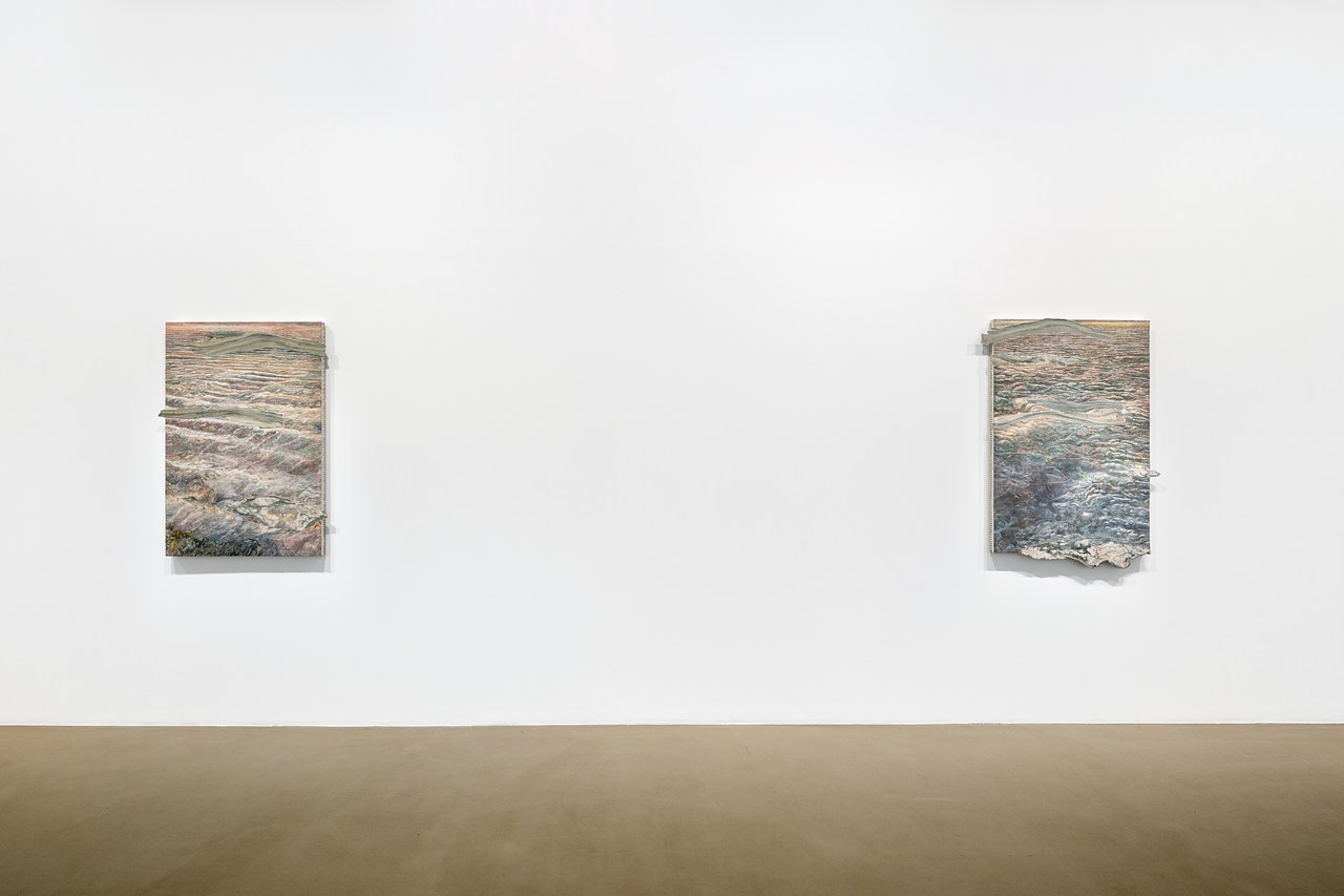 The works, created using the al fresco technique, merge various geological and historical temporalities, utilizing ancient techniques that slowly accumulate layers as the work is constructed. Each composition is divided into giornata, corresponding to what can be accomplished in a day of work while the medium, called the intonaco, remains fresh. Once it is dry, the pigments are bound to the worked surface and changes are no longer possible. The artist’s every gesture affixes the material like a temporal imprint, fossilizing the color and creating a form of contemporary archeology. The artist also embeds pieces of marble into each surface, giving the impression of missing parts, wear and tear, and perhaps even violence, a constructed sense of space and time that implies dense narratives floating beyond the viewer’s awareness.