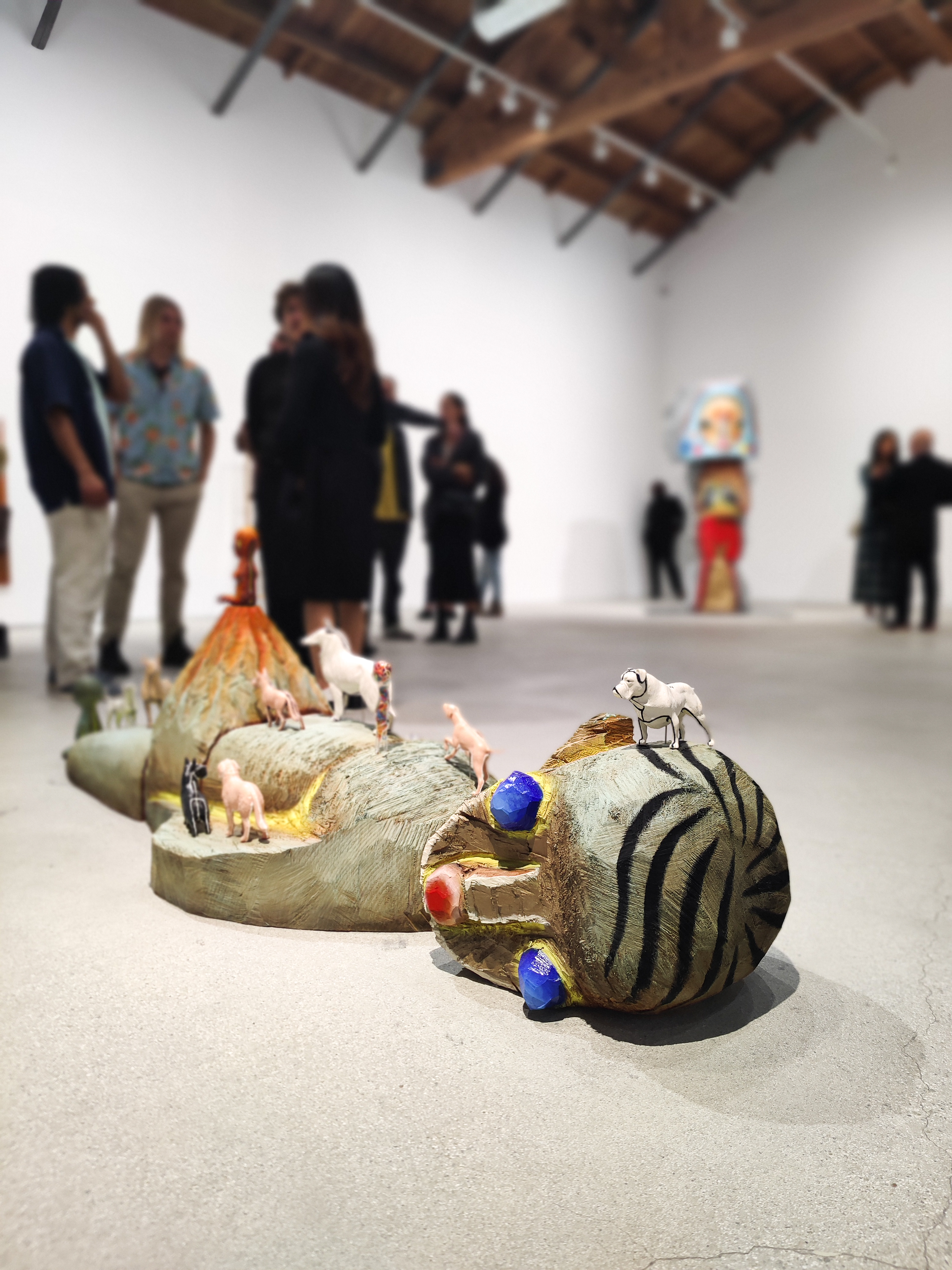 AO is on-site at Perrotin, which inaugurated its new Los Angeles gallery with an exhibition featuring Japanese artist Izumi Kato, running from February 28 to March 23, 2024. Kato’s work, known for incorporating elements of both ancient traditions and modern themes, aligns with Los Angeles’s landscape, which includes both natural and urban environments. The artist’s figures, created in his Tokyo studio, are displayed in a setting that reflects the coexistence of contrasting elements, a theme prevalent in Kato’s art.