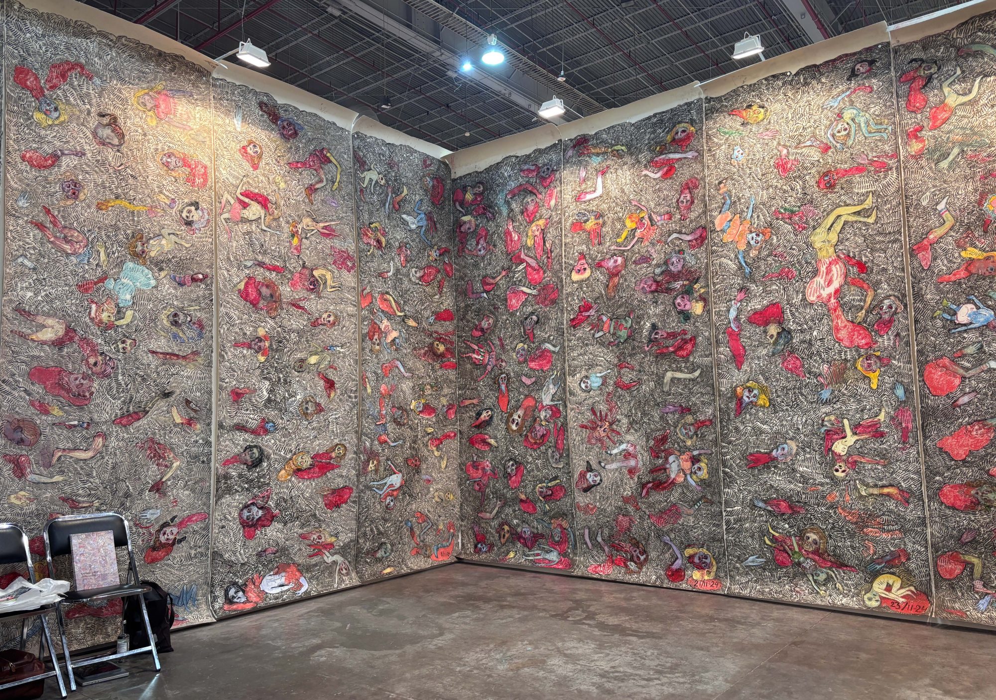 Norway’s OSL Contemporary dedicated their entire booth to a single installation by Vanessa Baird, which immediately became one of the most talked about works at the fair. The work, titled Lost Humanity: One Way Ticket to Mars, covers the walls in scrolls filled with human bodies suffering from violence and genocide. The piece was perhaps the only overtly political works at ZonaMACO, which has long been known for hosting more politically and socially engaged work than other international fairs.