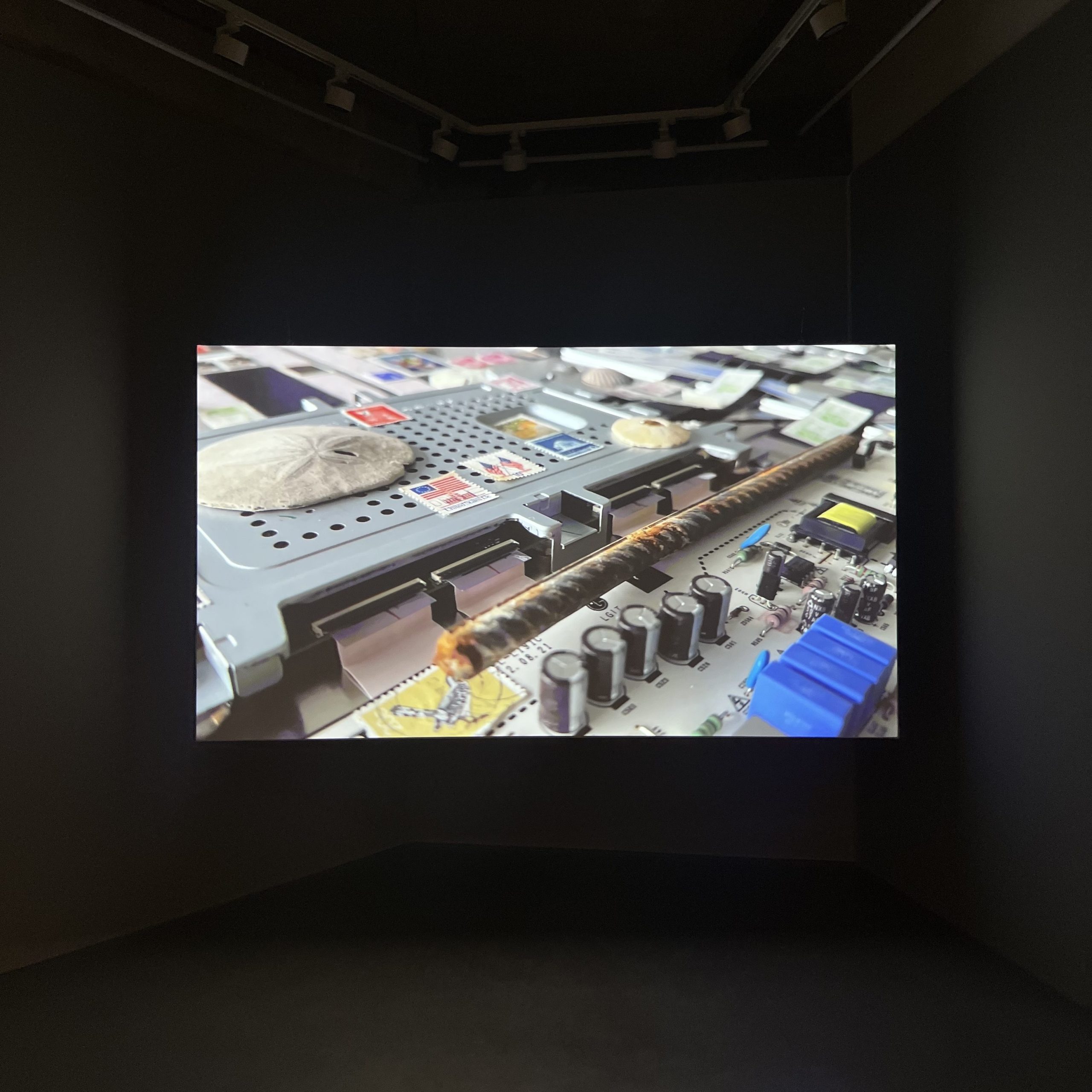 Though no order is prescribed, I began at 60 Three Colts Lane, a ground-floor space where works scatter glossy walls from the foyer into three enclaves. The film Travelling Camera (2025) is central to this part, displaying an aerial view of the circuit side of a 4K monitor; the camera pans over the board, a dense convection of wires and inverters that resemble the avenues of a cityscape. Tillmans disrupts this order with organic fragments: seashells, stamps, and rusted metal. The film demonstrates how the camera as a technology is integral to Tillmans’s process and to media history as a whole.