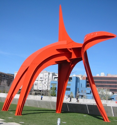 In the 1950s, he began to focus on monumental sculptures, many of which would become his most famous works. He created monumental pieces for JFK airport in 1957 and UNESCO in Paris in 1958. His largest piece, “El Sol Rojo” which was 20.5 meters tall, was created for the Mexico City Olympics of 1968. Many large stabiles found home in major American cities, like “Flamingo” which was placed in Chicago’s Federal Plaza and “WTC Stabile” which stood outside 7 World Trade Center when it was collapsed on September 11, 2001.