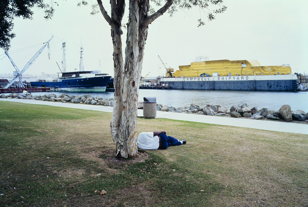 Allan Sekula, Man sleeping under a eucalyptus tree, Embarcadero park, (SD) from Fish Story (1989-1995), via Marian Goodman