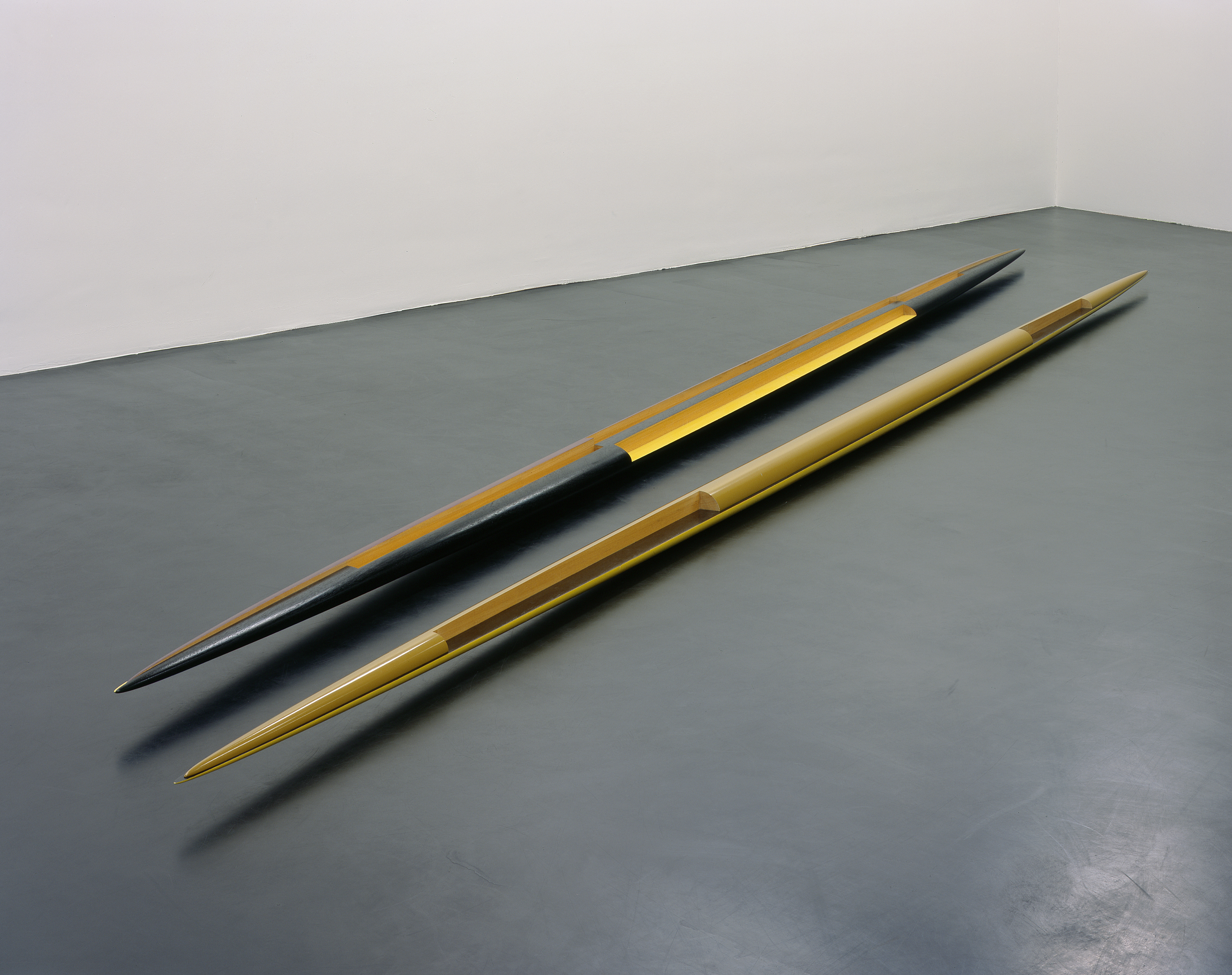 Isa Genzken. Rot-gelb-schwarzes Doppelellipsoid ‘Zwilling’ (Red-Yellow-Black Double Ellipsoid “Twin”), 1982. Lacquered wood, two parts. Overall: 9 7/16 x 8 1/16 x 473 1/4″ (24 x 33.5 x 1202.1 cm) Part one: 5 1/8 x 8 1/16 x 236 1/4″ (13 x 20.5 x 600 cm) Part two: 4 5/16 x 5 1/2 x 237″ (11 x 14 x 602 cm). Collection of the artist. Courtesy the artist and Galerie Buchholz, Cologne/Berlin. © Isa Genzken (more…)