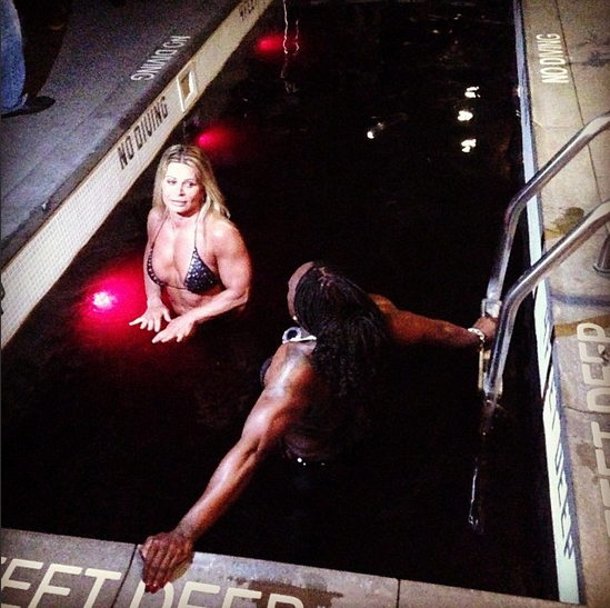 Bodybuilders in a pool of Diet Cola, by Mike Bouchet at Hotel Americano, via Ben Richards for Art Observed