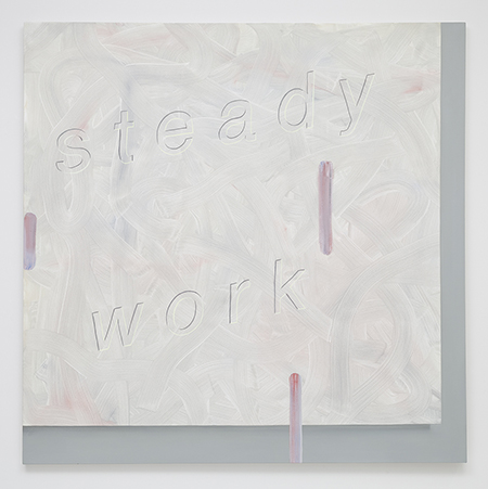 Gregory Edwards’ approach to abstraction is oddly figurative. For his latest solo show at 47 Canal, entitled Steady Work—the Brooklyn artist’s first since his solo debut in 2011—Edwards riffs on the inspirational sloganeering of the self-help genre. Featuring single words or short phrases painted amidst garishly colored, textured backgrounds, the show’s six works perhaps most strongly recall the increasingly vintage aesthetic of MS PowerPoint slideshows and WordArt.