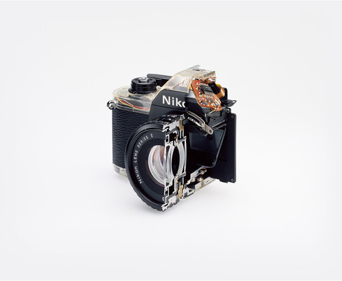 Christopher Williams, Cutaway model Nikon EM. Shutter:/Electronically governed Seiko metal blade shutter vertical travel with speeds from 1/1000 to 1 second with a manual speed of 1/90th./Meter: Center-weighted Silicon Photo Diode, ASA 25-1600/EV2-18 (with ASA film and 1.8 lens)/Aperture Priority automatic exposure/Lens Mount: Nikon F mount, AI coupling (and later) only/Flash: Synchronization at 1/90 via hot shoe/Flash automation with Nikon SB-E or SB-10 flash units/Focusing: K type focusing screen, not user interchangeable, with 3mm diagonal split image rangefinder/Batteries: Two PX-76 or equivalent/Dimensions: 5.3 × 3.38 × 2.13 in. (135 × 86 × 54 mm), 16.2 oz (460g)/Photography by the Douglas M. Parker Studio, Glendale, California/September 9, 2007– September 13, 2007. via The Museum of Modern Art, 2014.
