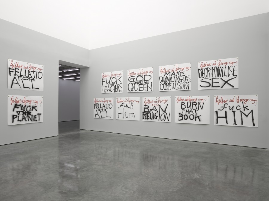 THE BANNERS is the title of Gilbert & George’s ongoing exhibition at White Cube’s Bermondsey location, following the eminent duo’s larger scale installment Scapegoating Pictures for London in 2014. Resuming their sturdily rebellious stand against anything corporate or organizational, this current exhibition, akin to their previous one, appropriates the vocal language of political outrage and public protests that have been normalized and spread widely by the media. As its self-explanatory title dictates, the exhibition includes thirty banners bearing ten different slogans and each repeating on three different white papers. (more…)