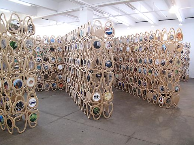 Friedrich Petzel Gallery, New York City, presents a new installation by Jorge Pardo, a porous maze furnished with images from the internet.  Pardo’s structures form narrow passageways through which observers must walk, an action reminiscent of negotiating library stacks.  Observers navigate an amalgamation of memories and images, taking in landscapes, monuments, and faces out of context.  The curving nature of the piece and the carefully cataloged bank of information lend the gallery a cerebral nature.