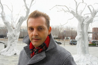 Ugo Rondinone with two of his works in lower Manhattan, 2007, photo by Charlie Samuels via artnet