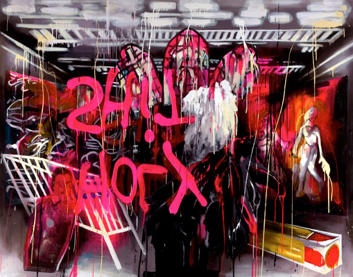 Currently in its last days at Deitch Projects 18 Wooster Street location is an exhibition of new paintings by Rosson Crow exploring the rebellious and lawless side of New York history. Entitled ‘Bowery Boys,’ the super-scale works comment on a long line of underground “bad boys” who have existed in New York City from the 1800s to the present day. Deitch Projects’ reputation for exhibiting and supporting the current generation of rebellious youth from this lineage makes this a fitting location for Crow’s sassy attempt to mimic the spirit of gangs, graffiti, drugs and illicit sex so inherent to the city she has called home for the past six months.