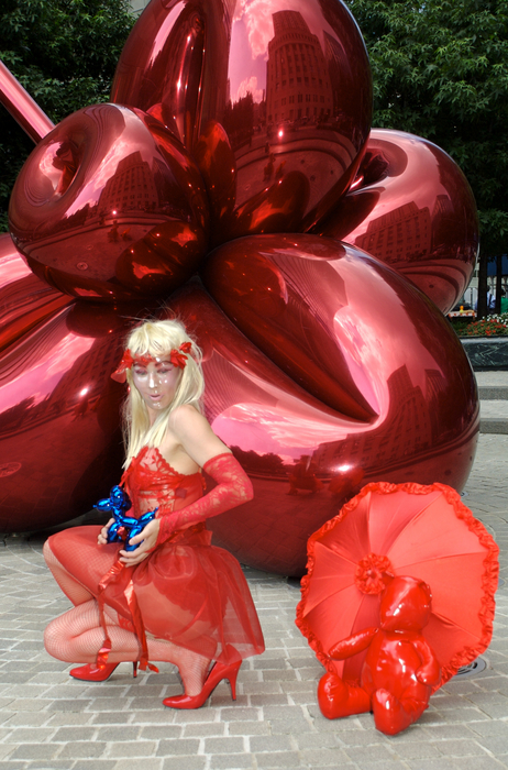 This week in lower Manhattan, two sculptures in the Financial District were integrated into a series of performances entitled “Hostile Takeover”, by Richard Move’s Moveopolis! dance company. On Tuesday, “Mariko Mori Drawings”, a piece based on Japanese anime, was held at William Tarr’s Rejected Skin sculpture on Water Street. Then on Wednesday, Blakeley White-McGuire, a former Martha Graham dancer performed “Red Cicciolina” in front of the 7 World Trade Center site of Jeff Koons’ sculpture. White-McGuire portrays La Cicciolina, former Italian cabinet member and porn star, as well as ex-wife of artist Koons.