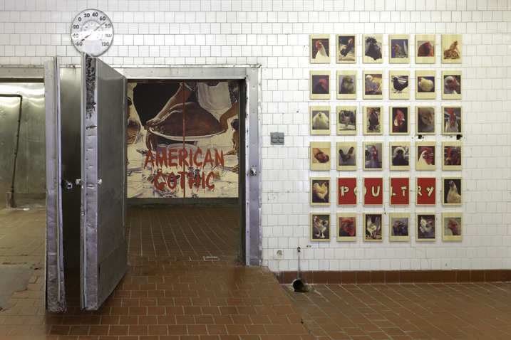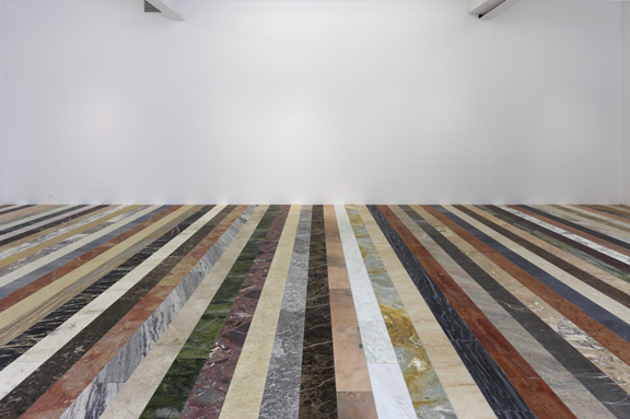 On view at Gavin Brown’s Enterprise are concurrent solo shows by artists Martin Creed and Jonathan Horowitz. Creed has fashioned a site-specific installation by remaking the gallery floor into a collage of more than 100 different slabs of marble. The exhibit also includes paintings, performance works, and the premier of a new film. The multi-room installation “Go Vegan” by Horowitz offers a unique perspective on vegetarianism and sustainability, and addresses the ever growing consumption of commoditized pop culture in contemporary society. This marks the inaugural exhibition of the newly expanded space at Gavin Brown’s Enterprise, which now extends into the 10,000 square foot space formerly occupied by the butchery and meat purveyor Pat LaFrieda Meats.