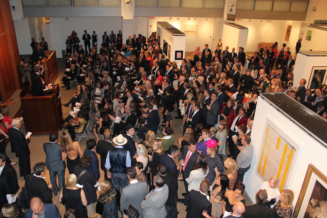 Monday night on the seventh floor of Sotheby’s, art enthusiasts took in a variety of works—many of them nudes or variations thereof—at the 20th annual Take Home a Nude benefit by the New York Academy of Art. A 6 o’clock cocktail hour loosened up bidders for the concurrent silent auction, closing at 8:30 with a live auction, followed by dinner downstairs at 9:00. The night honored artist Jenny Saville and critic John Richardson, with artists Jeff Koons (in attendance further down town at the National Arts Awards) and Nan Goldin up for bid at the live auction, while artist Dustin Yellin—whose work caught the eye of Mary-Kate Olsen—fetched the highest bid at the silent auction at $9,500. However, Alyssa Monk’s Soft went to live auction after fierce bidding during the silent auction, fetching a final $12,000, and the evening’s overall highest piece was Joseph Kosuth‘s ‘Texts (Waiting for-) for Nothing’, Samuel Beckett, in play, 2011 at $37,500.