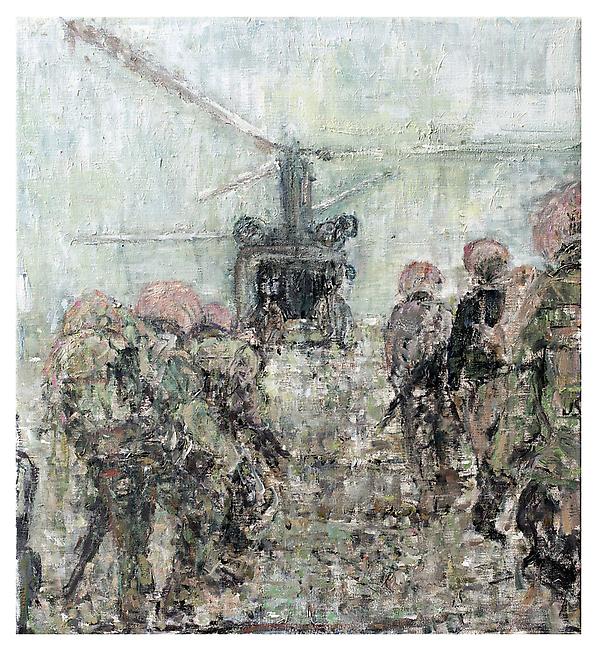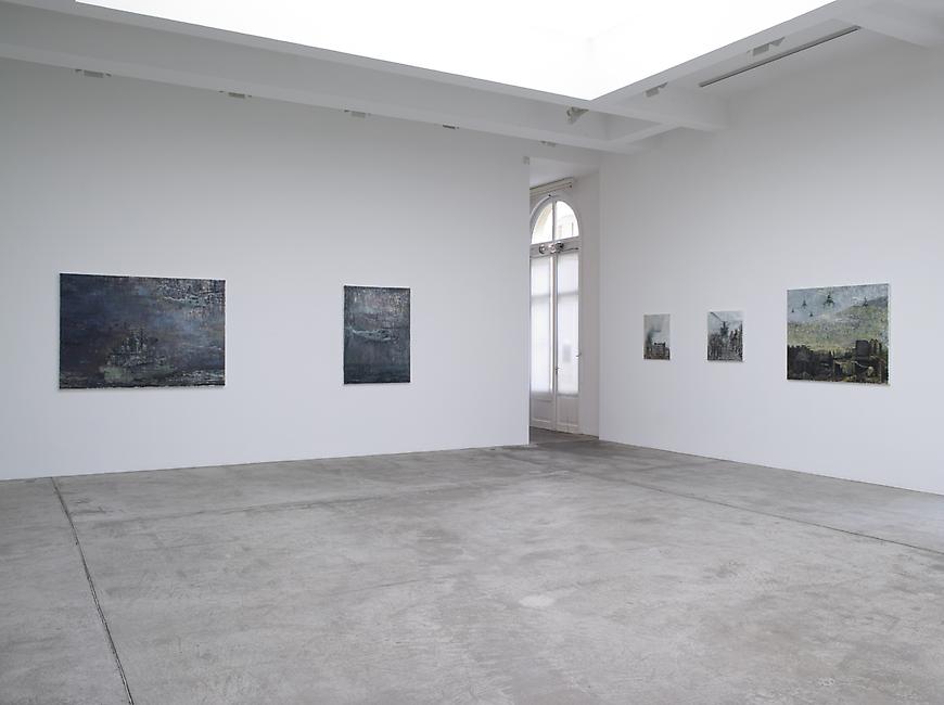 Limbo, the state of being suspended in time, between past and future, repose and action, is the title of Sabine Moritz’s first solo show with Marian Goodman Gallery in Paris.  Spread over two floors, the exhibition includes eighteen oil on canvas paintings, and over sixty drawings, a dense body of work started in late 2001.  Moritz, who lives and works in Cologne, Germany, was on her way to New York City on September 11th, when her plane was diverted up to Nova Scotia. For three days she was stuck in this remote landscape, with thousands of other displaced travelers, watching the events and its aftermath unfold. This period of waiting and disconnect, gave her time to reflect about the changing nature of borders, conflict, and the technology of war.