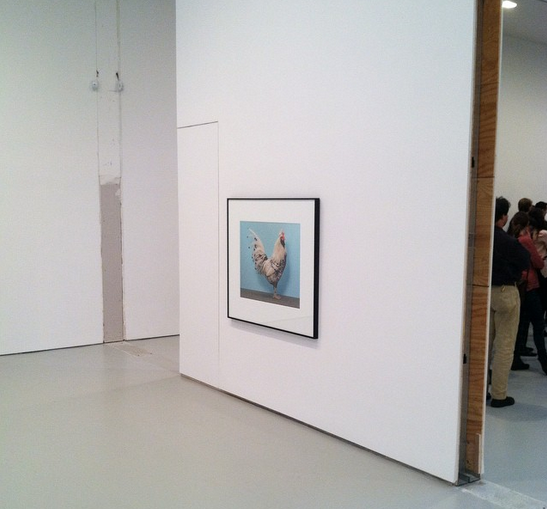 Placing these three sets of pieces along calculated sight lines, Williams’s manipulated walls effectively break the space of the room into various thematics based on the viewer’s position.  Depending on position, the viewer may contend with the camera alongside an image of the chicken, or perhaps the broken headlight in all of its cosmetic interference alongside a shining pan.  In each intersection, the idea of publication and the editorial decision, the act of depiction and its formatting within certain standards, takes a prominent role.