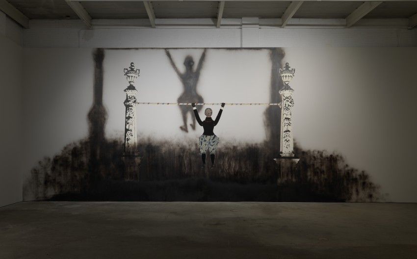 The exhibition is composed of a series of variations on Williams’s ongoing fascination with the value of the image, and its role as a circulator of information and ideology in contemporary capitalism.  During the construction of the show, or rather, the deconstruction of the prior show, Marcel Dzama’s Une Danse de Bouffons, Williams elected to remove several dividing walls, and, rather than remount them seamlessly, left them standing solitary, bearing the scars of their removal.  As a result, the exhibition is divided by a series of walls that seem to have slightly broken free in the exhibition space, a peculiar visual phenomenon that also serves as one of the core conceits for the artist’s work.