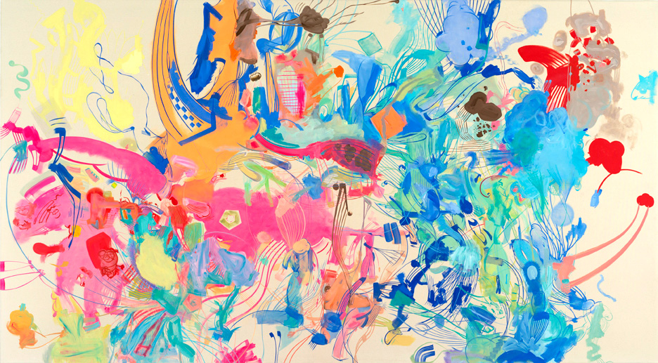 303 Gallery presents Sue Williams WTC, WWIII, Couch Size, on view through February 22nd, 2014. Williams’ ninth solo exhibition with the gallery, this show features six new large-scale paintings, of ‘couch-sized’ proportion.  This titular reference to the commercial appraisal of artworks marks the comic butt of a seemingly sinister thematic program, which proclaims the World Trade Center and World War III as its subject. Williams’ nominal list introduces the ironic tone that colors her paintings, their dark subject matter bursting with chromatic brilliance and her signature comic levity.