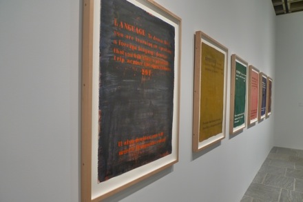 The exhibition’s overarching theme, of course, is words and their constantly shifting relationships with context and message. As the curators explain, “In all his paintings there are tensions and frictions at play: between foreground and background, between text and image, and between how words look and what they mean.”
